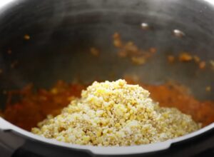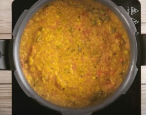 - Step 5: Cook:Pour in 3 cups of warm water or vegetable stock. Taste and adjust salt.Pressure Cooker Method: Close lid and cook for 2 whistles on medium heat. Let pressure release naturally.Stovetop Method: Cover and simmer for 25–30 minutes, stirring occasionally. Add more water if needed for porridge-like consistency.