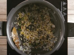 - Step 2: Build the Flavor Base:Heat ghee or coconut oil in a heavy-bottomed pot or pressure cooker.Add cumin seeds, mustard seeds, and bay leaf. Let them splutter.Add chopped onion and slit green chili. Sauté until onions are golden.Stir in grated ginger and minced garlic. Cook for 30 seconds until fragrant.